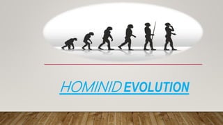 The document summarizes hominid evolution and human origins. It outlines the major theories of human evolution such as Lamarckism, Darwinism, and the modern synthesis. The timeline of human evolution is also presented, beginning around 7 million years ago and progressing through key stages such as Homo erectus and Homo sapiens. Unique characteristics of modern humans like bipedalism and tool use are also discussed.
