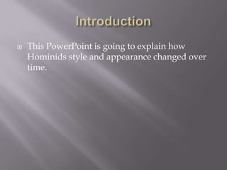 This PowerPoint summarizes the evolution of various hominid species over time, including Austropithecus afarensis, Homo habilis, Homo erectus, Homo sapiens neanderthalensis, Homo sapiens, and Homo sapiens sapiens. Key changes included increases in brain size, the ability to walk upright, early tool use, clothing, and more complex clothing and manufacturing over time. The document traces how hominids became taller, had smaller eyebrow ridges and more prominent chins, and became the most technologically advanced species, Homo sapiens sapiens.