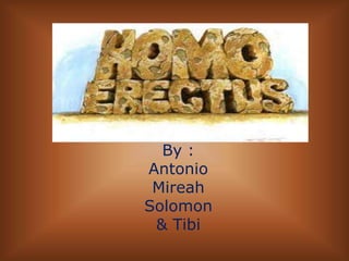 Homo erectus were early hominids that lived approximately 1.4 million years ago. They made tools like spears and hand axes from strong materials. Homo erectus were notable for being the first hominids able to control their body temperature through sweating. They had smaller brains than modern humans but were similar in having upright posture and long legs.