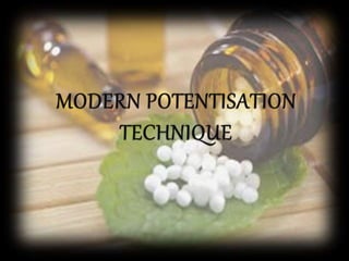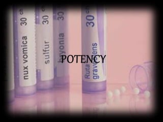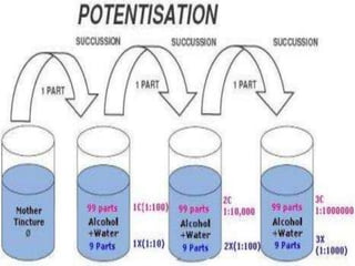 This document provides information about potentization in homeopathy. It begins with definitions of potentization from various homeopathic authorities and explains that it is a mathematico-mechanical process of diluting substances to increase their therapeutic power. The history of potentization dating back to Hahnemann is overviewed. The objectives and effects of potentization are described. The processes of trituration and succussion used to create potentized preparations are defined and their mechanics explained. The scales used to represent potency levels in homeopathy are introduced.