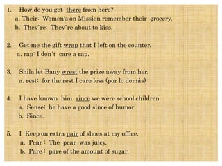 This document lists homonyms, or words that sound the same but have different meanings and spellings. It provides examples of sentences using homonyms and their correct definitions. Some common homonyms included are their/there/they're, rap/wrap, sense/since, pear/pare, right/write/rite, border/boarder, gild/guilt, steel/steal, currant/current, pie/pie, weir/wear, heir/air, altogether/all together, vane/vain, add/ad, aye/I, bore/boar, pear/pare.