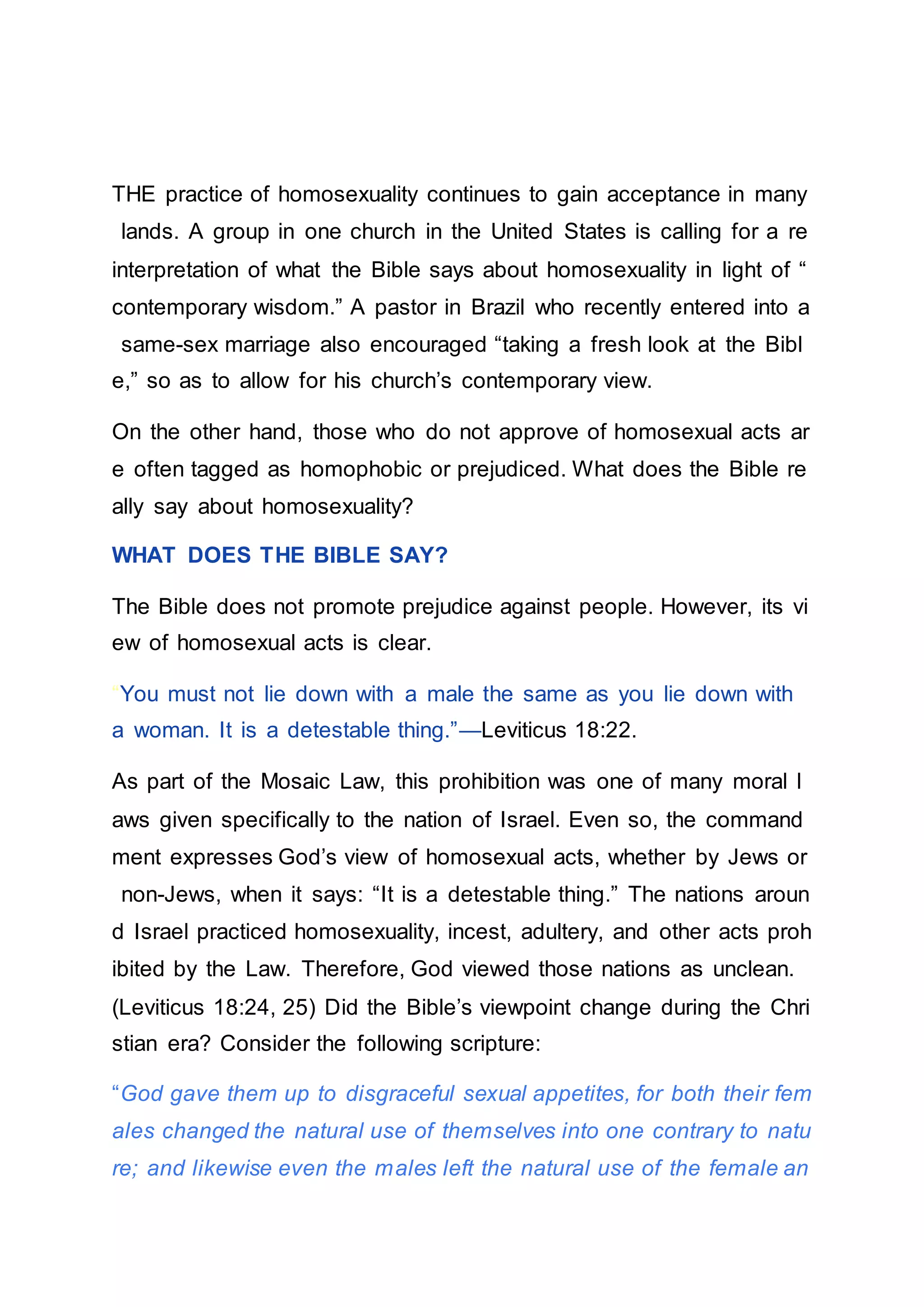 The document discusses what the Bible says about homosexuality. It provides several biblical passages that condemn homosexual acts as unnatural and detestable. While the Bible does not condemn those struggling with homosexual desires, it does not condone acting on those desires. The Bible's view on homosexuality cannot be changed to conform to contemporary views. However, the Bible also says God wants all people to be saved and come to accurate knowledge, and it welcomes sincere ones who seek to live according to his standards.