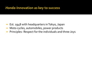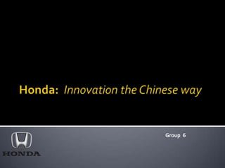 Group 6 was established in 1948 in Tokyo, Japan and produces motorcycles, automobiles, and power products. Honda emphasizes respect for individuals and three principles of joy. Honda established its Guangzhou Honda Development Research center (GHRD) in China as the first automaker to develop products under an original brand through a joint venture. The goal of GHRD was to become an inspiring and energetic research environment to develop whole car research and development, including the Li Nian brand which aims to be a top international automobile brand supported by Honda's technologies.