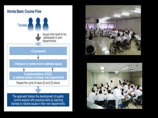 Honda is a large Japanese manufacturer of automobiles and motorcycles. It employs over 179,000 people and has subsidiaries like Acura. Honda implements total quality management to continuously improve products and processes. This involves management, workforce, suppliers, and customers. Honda uses a quality cycle and quality enhancement system to implement TQM using methods like the PDCA cycle to bridge gaps between targets and current performance. Honda also provides quality management education to improve worker skills. Honda recalled over 962,000 vehicles globally to repair power window problems.