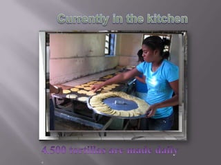 This document discusses improving facilities at a school called Escalon in Honduras. It notes that the current kitchen is too small and lacks hygienic conditions, accommodating only 150 students despite having 550 enrolled. Renovations proposed include installing ceiling and wall fans in dorm rooms for ventilation, purchasing new industrial kitchen equipment like grills and stoves, and buying appliances, sinks, and cooking utensils to upgrade the kitchen. The total estimated costs provided are $15,300 for dorm ventilation and $17,000 for new kitchen equipment and appliances.