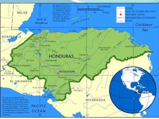 Honduras was discovered by Christopher Columbus in 1502 during his fourth voyage. It gained independence from Spain in 1821. The document provides details about Honduras such as its geography, demographics, economy, culture, and sites of interest. Key facts include that Honduras has a population of over 7.5 million people, Spanish is the official language, agriculture is an important economic activity including bananas and coffee, and soccer is a favorite pastime.