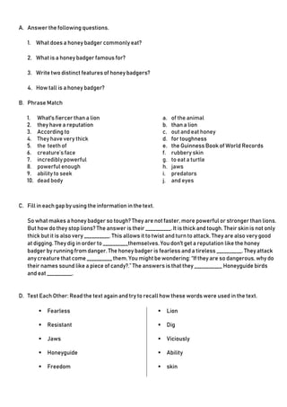 1. The honey badger is a small but fearless animal known for its toughness and aggression.