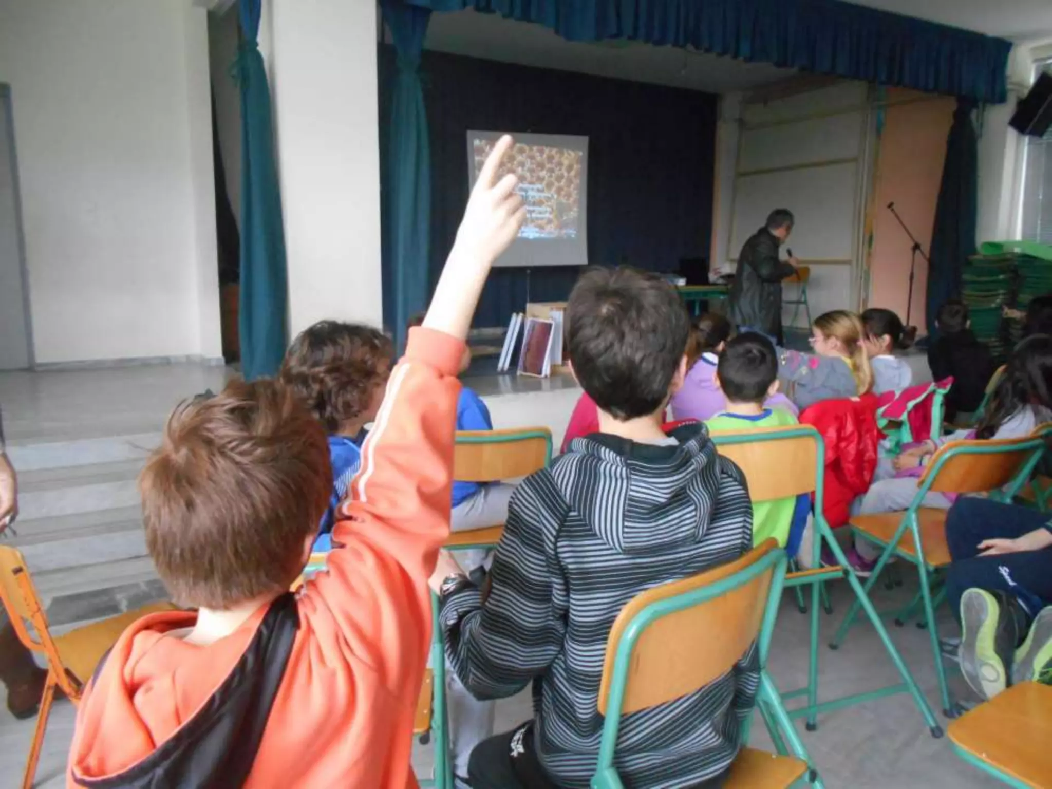 The students at the 32nd Primary School in Patra, Greece had a presentation from a parent about bees, honey production, and the benefits of honey. The parent explained how bees live in hives and work together to produce honey, giving the students an informative talk. The presentation encouraged the students to enjoy honey.