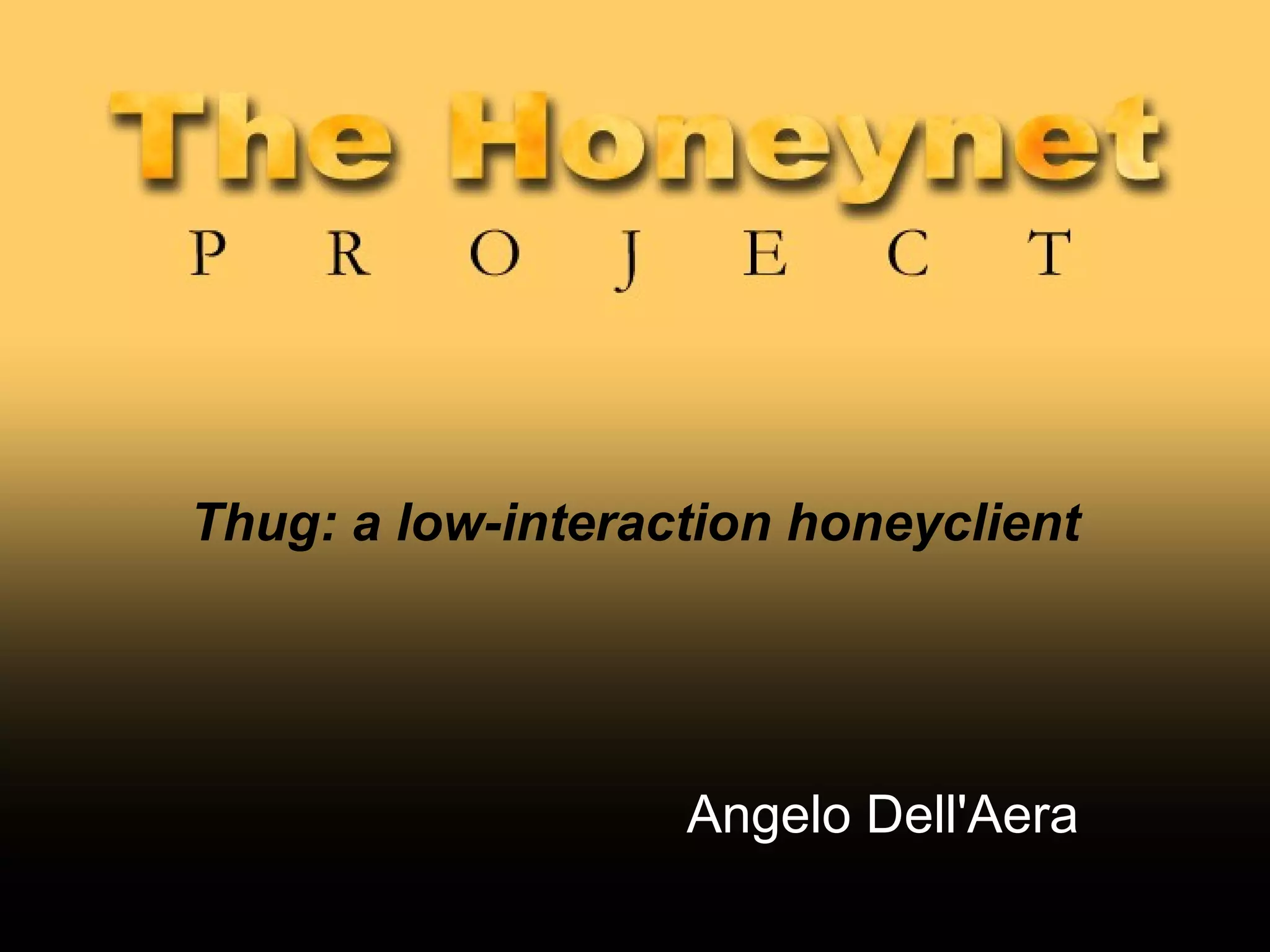 This document summarizes Thug, a low-interaction honeyclient for analyzing client-side attacks. It discusses how Thug emulates browser behavior and plugins to appear as a real browser. Thug uses the V8 JavaScript engine and supports logging and analyzing events using various formats. The document outlines Thug's DOM emulation, event handling, browser personalities, vulnerabilities modules and classifiers for detecting exploit kits.