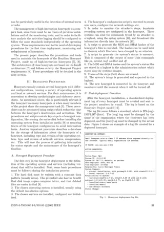 The document discusses the maintenance procedures and tools for honeypots in the Brazilian honeynet project, detailing automation scripts that facilitate the management of high-interaction honeypots. It outlines the deployment, monitoring, and deactivation processes, emphasizing the importance of documentation and standardized data collection. The paper describes procedures to minimize human error and streamline the recovery and analysis of compromised honeypots.