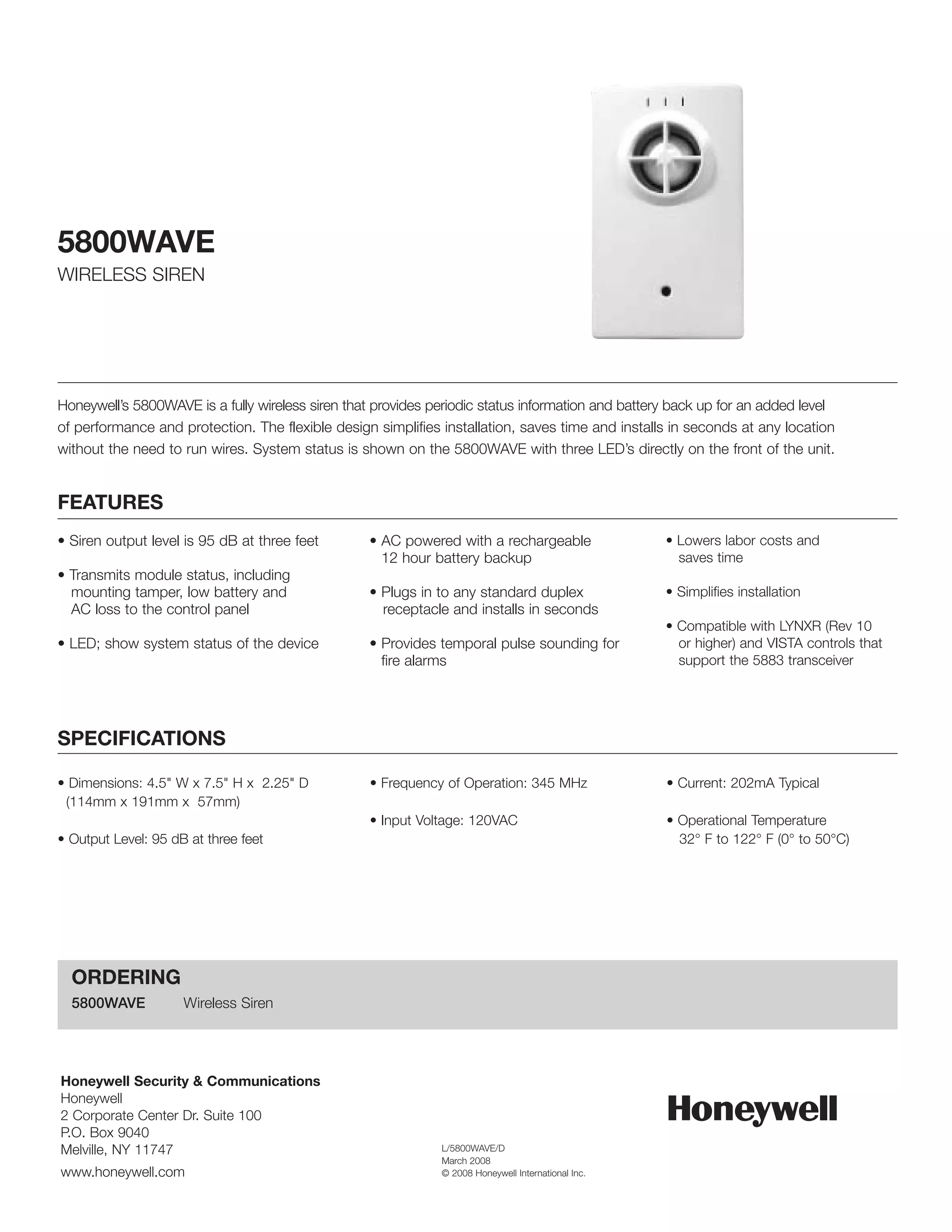 The 5800WAVE is a fully wireless siren that provides status information and battery backup without needing wires. It simplifies installation by plugging into any standard receptacle and installing in seconds. The siren's output level is 95 dB at three feet and it is AC powered with a 12 hour battery backup. LED lights on the front show the system status.