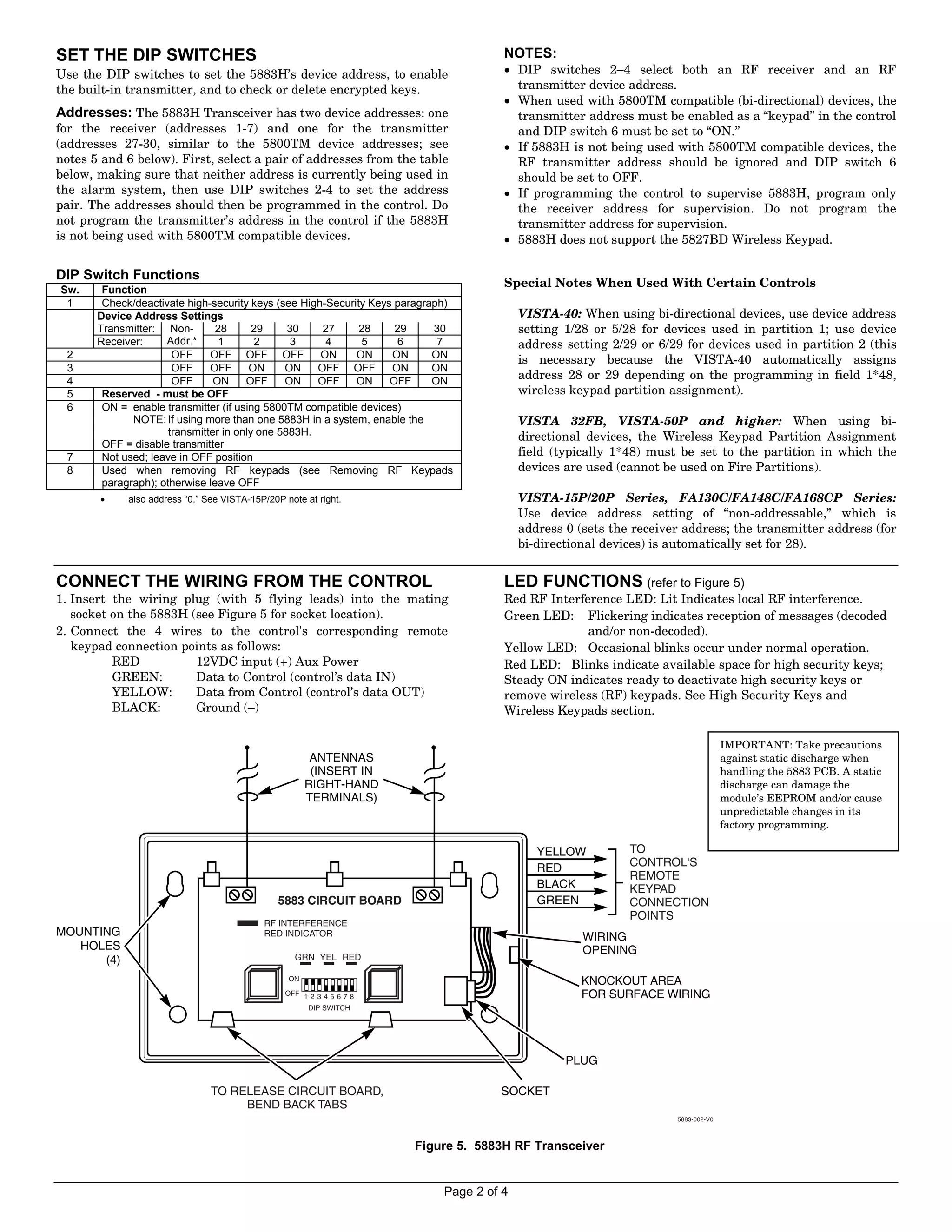 The document provides instructions for installing and setting up the ADEMCO 5883H RF Transceiver module. Key points include: