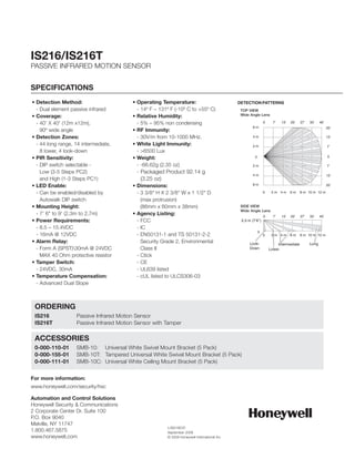 The IS216 and IS216T are passive infrared motion sensors that offer quality detection in an attractive white housing. They feature temperature compensation, microprocessor control, and adjustable sensitivity levels. The IS216T additionally contains a tamper switch. Both sensors are flexible to install, mounting easily on walls or corners, and provide coverage of 40' x 40' with wide angle detection zones.