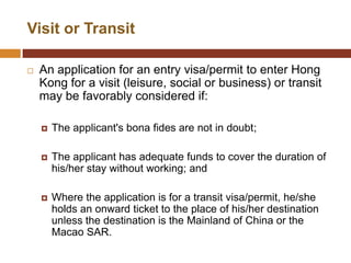 This document provides information about various visa options for visiting, working, or investing in Hong Kong. It discusses the eligibility requirements and application processes for different visa types including employment visas, investment visas, the Capital Investment Entrant Visa, and Quality Migrant Admission Visa. Specific information is also provided about visa schemes for non-local graduates, mainland Chinese professionals, and foreign domestic helpers.