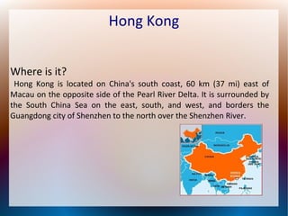 Hong Kong is a special administrative region located on the eastern side of the Pearl River estuary in China. It has a population of over 7 million people and its three main cities are Victoria City, Kowloon, and New Kowloon. Hong Kong has a mix of Chinese and British influences and is described as the place where East meets West. Some popular traditional aspects of Hong Kong include Cantonese cuisine, feng shui, and Chinese traditions.