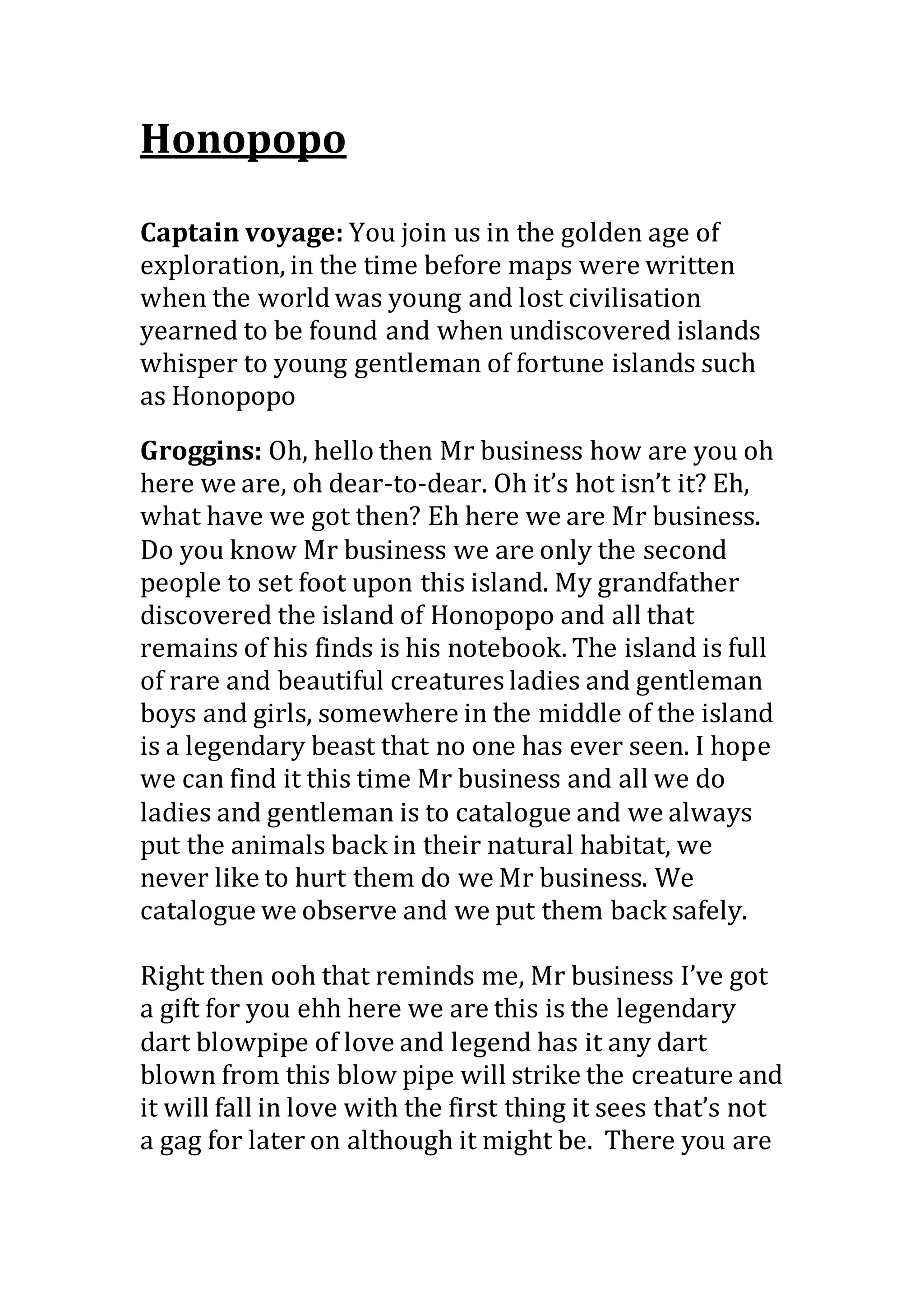 The document describes an expedition to the unexplored island of Honopopo led by Captain Jon Voyage and his assistant Groggins. They have come to explore and document the rare creatures on the island. Groggins mentions that his grandfather previously discovered Honopopo and that there is a legendary beast somewhere in the interior that has never been seen. Their original crew of 10 has been reduced to just Voyage and Groggins due to deaths from dysentery. They hope to find and capture rare animals to bring back, observe, and catalog as part of their scientific exploration of the uncharted island.