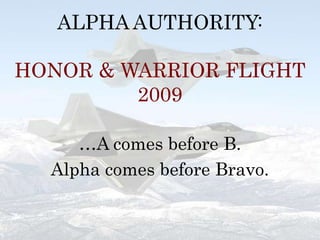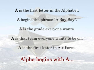 A is the first letter of the alphabet and begins many words and phrases. This document outlines the missions and activities of an Air Force ROTC flight called Alpha Authority from 2009, which focuses on recruiting and preparing cadets through activities like studying, physical training, dining out briefings, and chalking campuses. The flight commander is named and members are listed who take on leading roles in completing various missions to support the group.