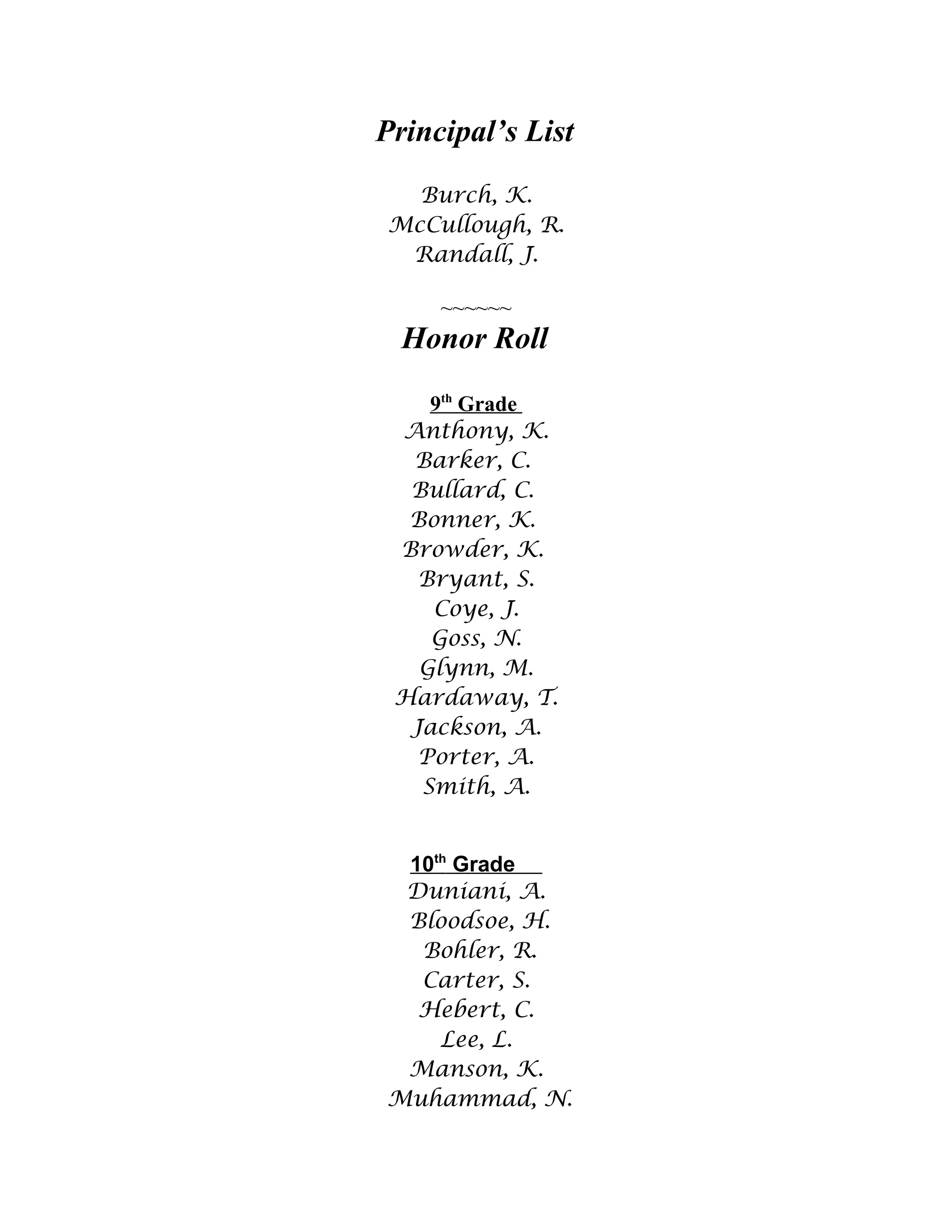 This document lists students who earned honors for their academic achievement. It includes 3 students on the Principal's List and lists of students in the 9th through 12th grades who made the Honor Roll. A total of 41 students across four grade levels are recognized.
