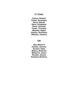 The document lists students who earned placement on the Principal's List or Honor Roll for their grade level. It provides 3 categories: Principal's List with 3 students' names, Honor Roll broken down by grade (9th-11th) with 1-3 students listed in each grade, and 12th grade Honor Roll with 7 students' names.
