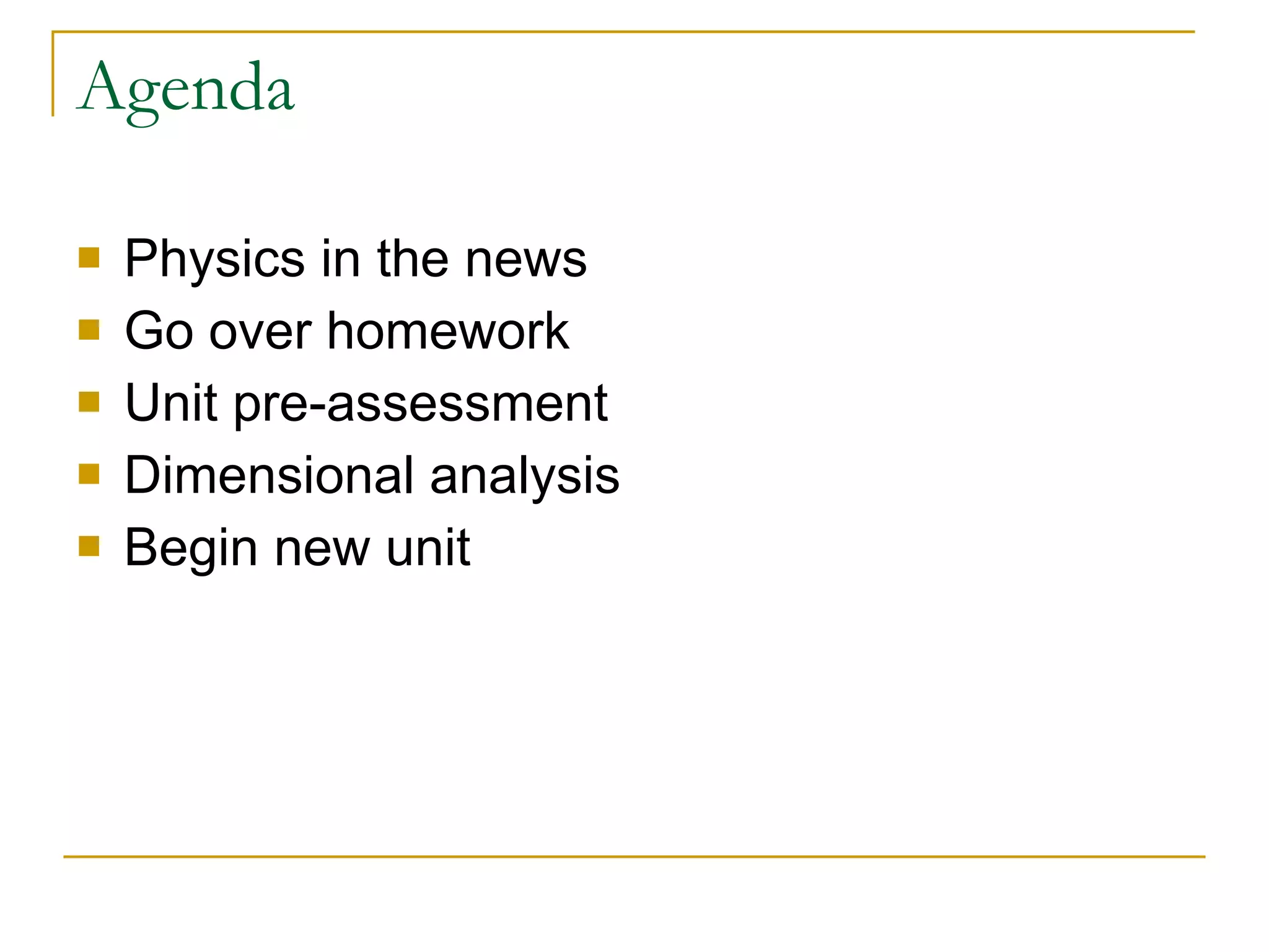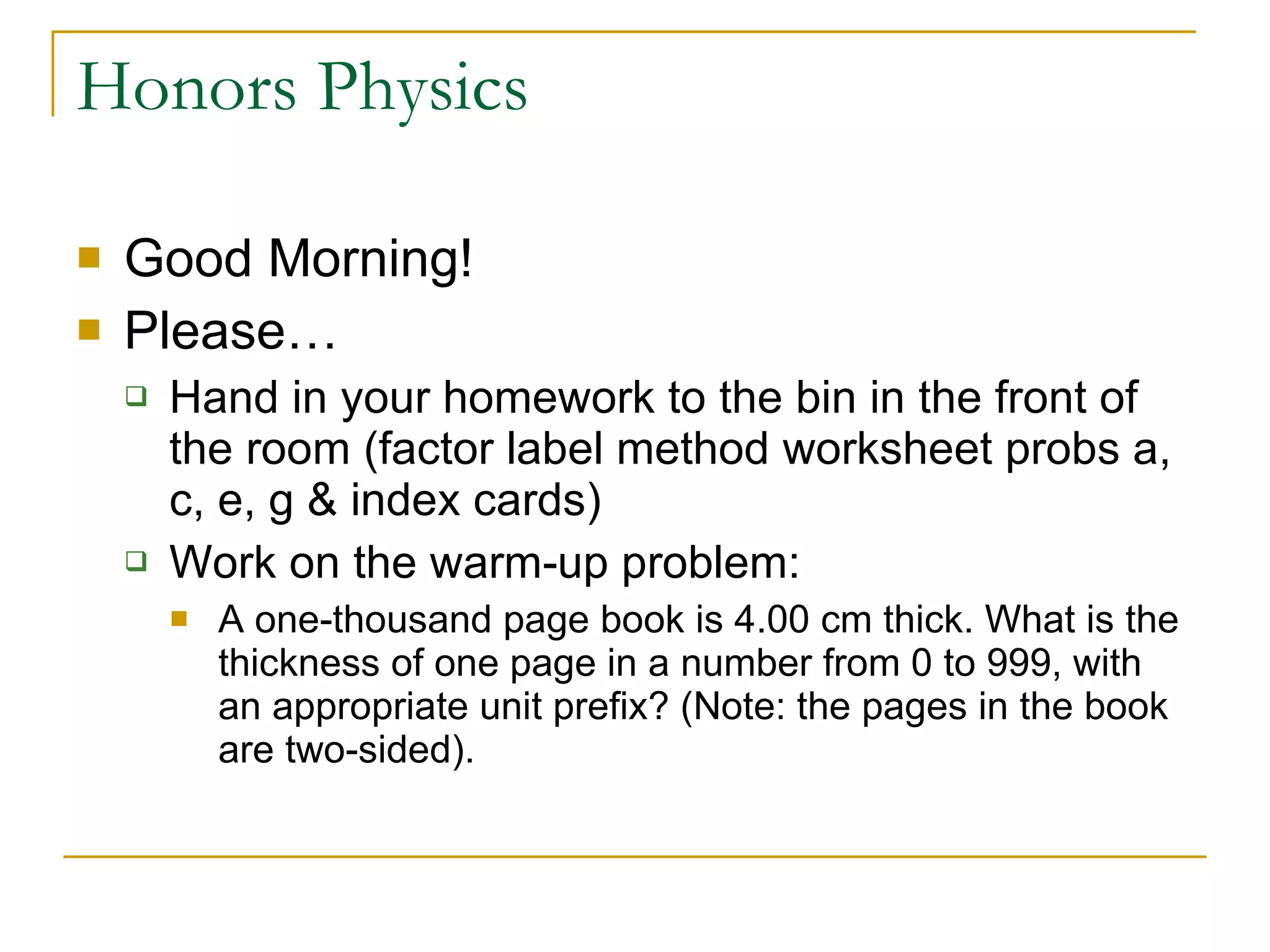 The document contains notes from an Honors Physics class. It includes information about homework assignments, the day's agenda which involves physics in the news, dimensional analysis, and a new unit on motion. There are also example physics problems and diagrams relating to displacement, velocity, and using graphs of displacement vs time to determine an object's velocity at different points.