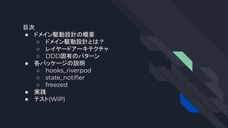 大規模アプリを作るときの指針として、hooks_riverpod、state_notifier、freezedを使ってドメイン駆動設計を取り入れた場合の実装例を紹介。2021/12 Flutter大学の勉強会にて登壇した資料。。