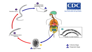 Hookworm is an intestinal parasite spread through contact with contaminated soil. It has a complex lifecycle involving eggs hatching in soil into larvae that penetrate human skin, traveling to the lungs and then intestines where they mature into adult worms, feeding on blood and causing anemia. Symptoms include abdominal pain, diarrhea, and protein deficiency. Diagnosis involves microscopic examination of stool samples. Treatment involves anthelmintic drugs like albendazole or mebendazole. Prevention focuses on improved sanitation and not walking barefoot in contaminated areas.