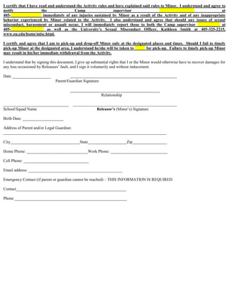 This document is a release and acknowledgement form for minors participating in activities or camps on the University of Oklahoma's facilities or on external field trips. It releases the university from liability for any injuries or damages resulting from participation. The parent or guardian signs to grant permission for participation, acknowledge risks, and agree to the university's rules. They also consent to emergency medical treatment and authorize use of photos/videos. Contact information is provided in case of emergency.