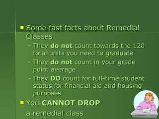 The document provides information about remedial classes, degree requirements, general education requirements, and registering for classes at Humboldt State University. It explains that remedial classes do not count toward degree requirements but are important to complete in the first year. It outlines the units needed for different degrees and categories like general education, major requirements, and electives. It also describes requirements like American Institutions, diversity and common ground, and registering for classes using codes and time formats.