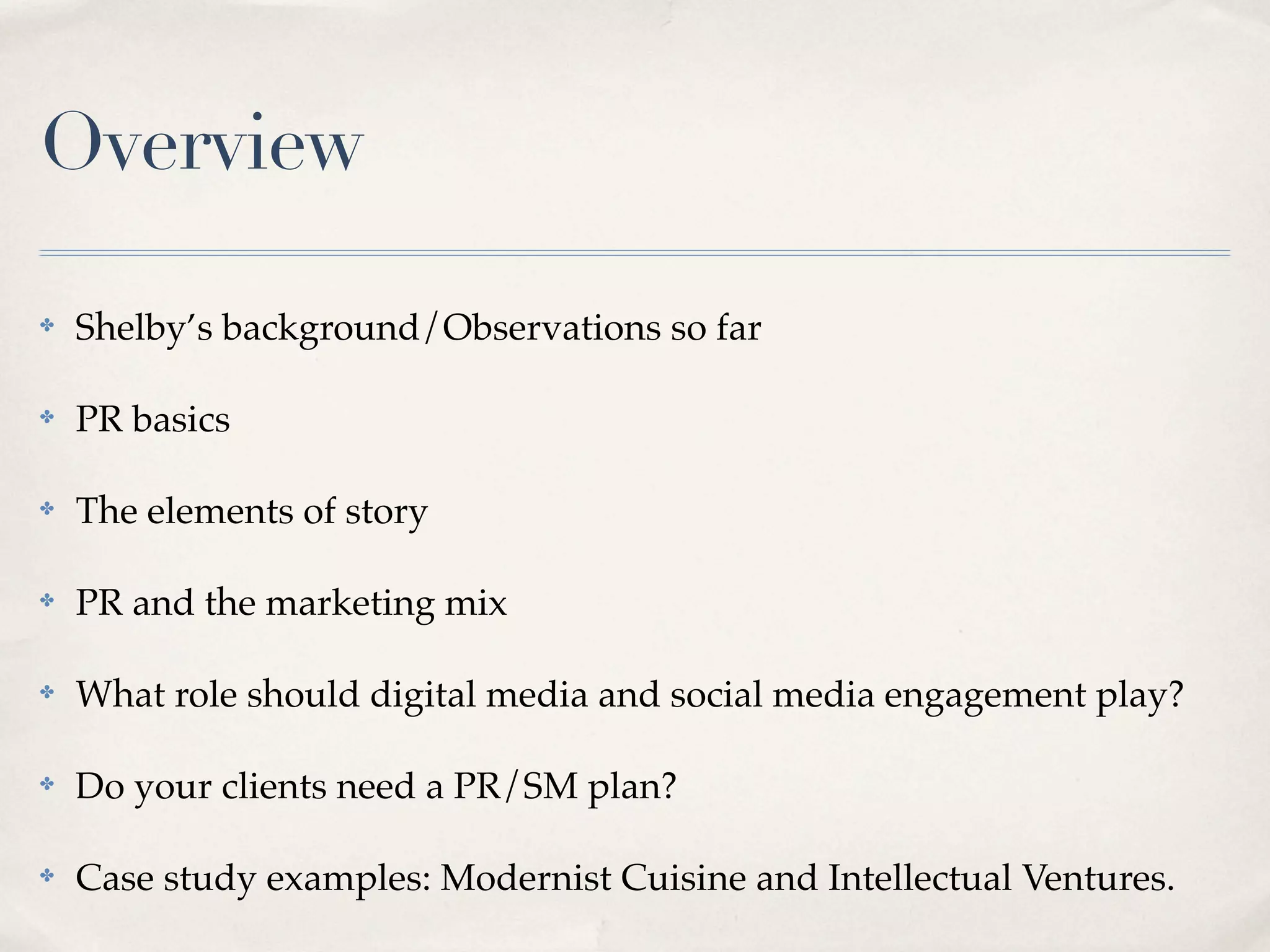 The document discusses public relations strategies and the role of social media. It provides an overview of PR basics like developing relationships between clients and their public to influence opinions. It discusses the importance of crafting compelling stories and targeting the right audiences. The document also explores how social media has changed how brands engage in conversations and the need for PR strategies to consider digital and social media engagement. It provides case studies of how companies have used social media and urges readers to think about how these strategies could apply to their clients.