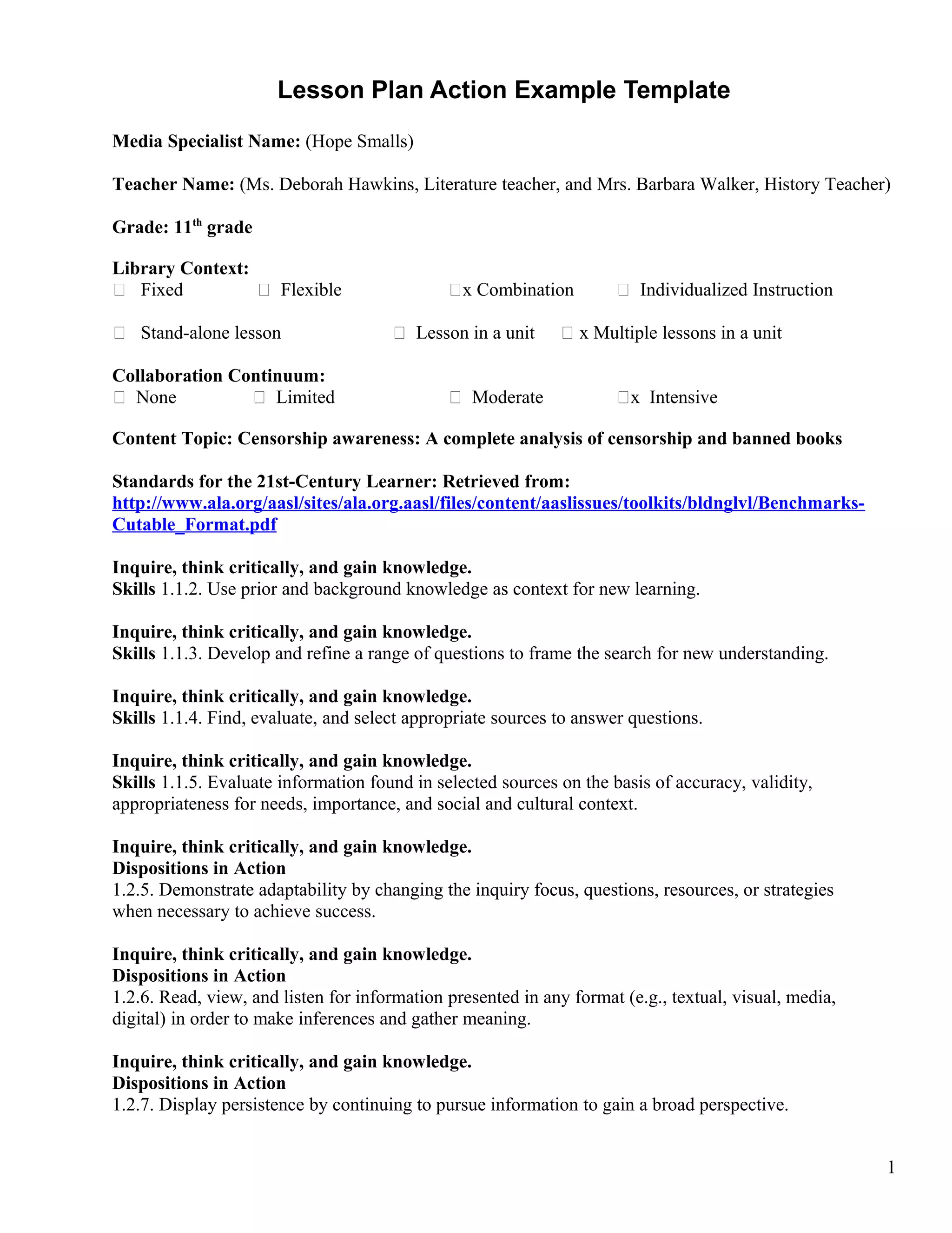 This lesson plan involves two teachers - a literature teacher and a history teacher - collaborating with the media specialist to teach 11th grade students about censorship and banned books. Students will examine novels like Their Eyes Were Watching God and Adventures of Huckleberry Finn that have been controversial and sometimes banned. They will discuss reasons books may be banned or censored while also considering perspectives on promoting diversity and complex themes. Students will use strategies like summarizing, questioning, and visualizing to analyze texts and consider different viewpoints on censorship issues. Assessment includes students creating summaries, response logs, and an infographic to demonstrate their understanding.
