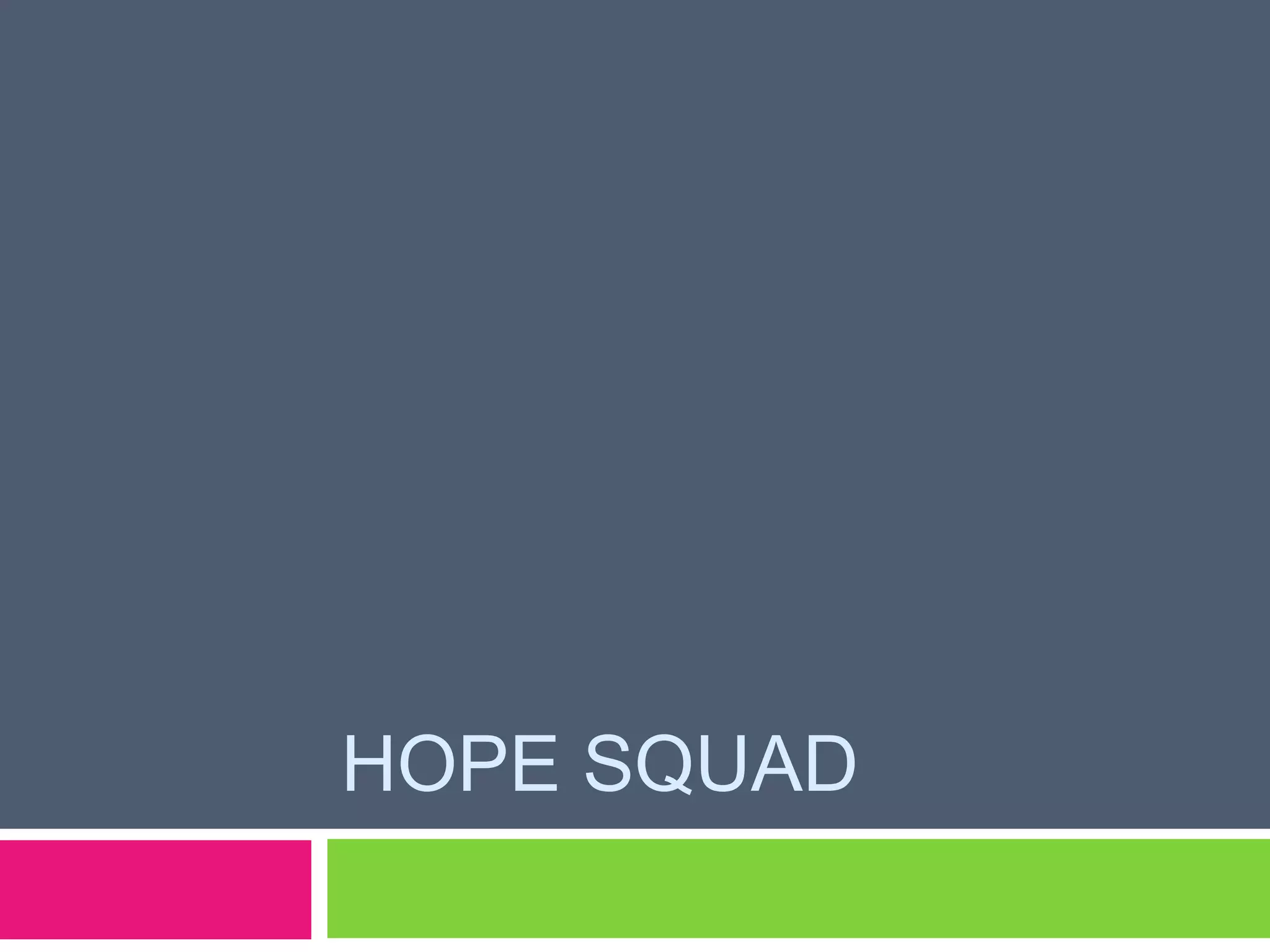 The document discusses the introduction of a HOPE Squad program to the Weber School District. A HOPE Squad consists of trained student peers who watch out for at-risk students, provide friendship, identify warning signs of suicide, and seek help from adults. Students will nominate their trustworthy classmates to serve on the HOPE Squad and be trained in suicide prevention. The goal is for peers to recognize signs of depression or suicide in other students and ensure they get help from an adult.