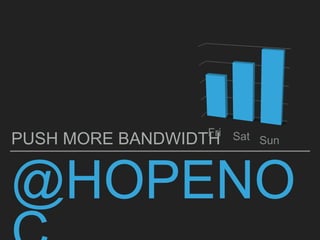 This document summarizes the network upgrades and operations for HOPENOC 2016. Key points include: installing 10G fiber connections and running fiber between floors for redundancy; sourcing and configuring new networking hardware including switches, wireless access points, and controllers; obtaining IP address space and establishing BGP; transporting and staging equipment; and standing up critical network services just before the conference. Network usage peaked at over 500Mbps wireless usage and 1.76Gbps total bandwidth. Monitoring showed high wireless client counts but only moderate issues. Lessons learned include encouraging more encrypted WiFi usage and bandwidth consumption.
