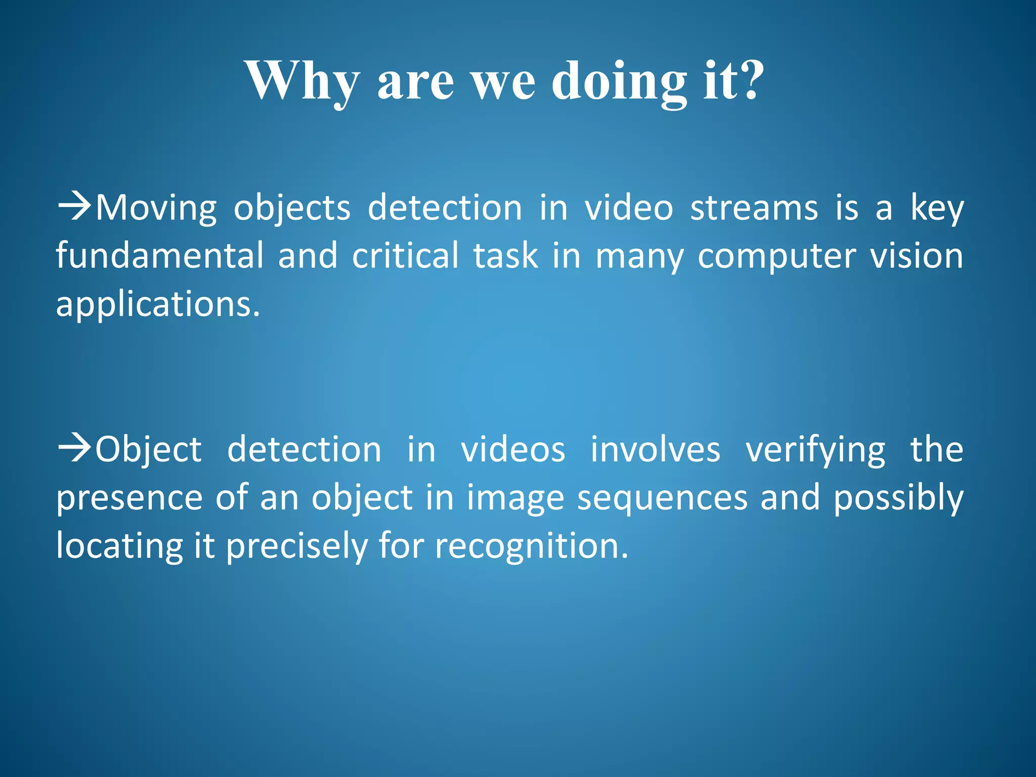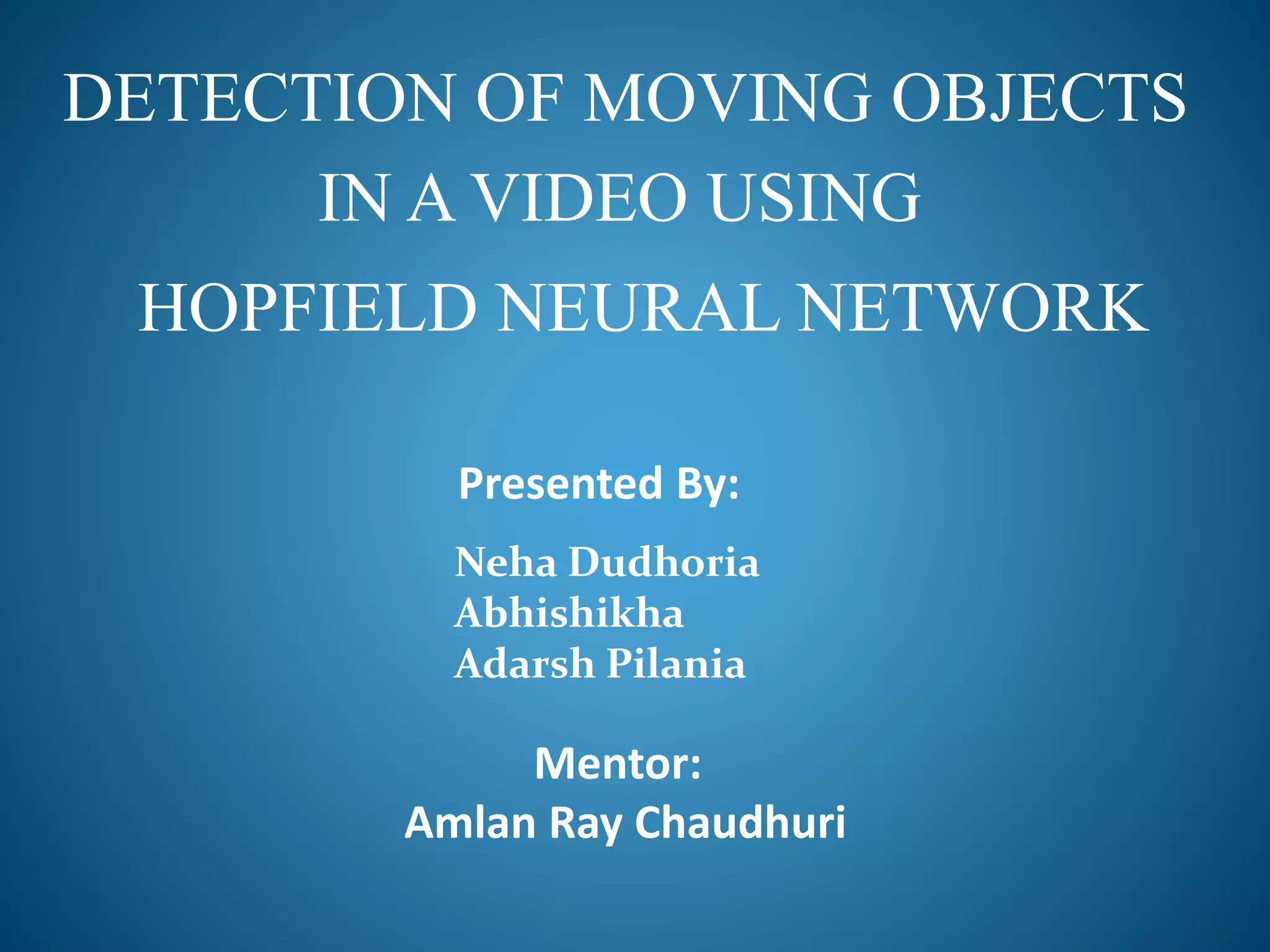 The document describes using a Hopfield neural network to detect moving objects in videos. The objective is to devise a method to identify differences between frames to detect movements. A Hopfield network is used because it can serve as a content addressable memory. The network consists of neurons corresponding to pixels that are connected to neighboring pixels. Difference frames are obtained and iteratively updated until the network reaches a stable minimum energy state. This allows changed and unchanged pixels to be classified. Applications include video surveillance, people tracking, and traffic monitoring.