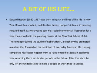 Edward Hopper (1882-1967) was an American realist painter born in Nyack, New York. He studied commercial illustration and painting in New York. Hopper spent time studying in Paris but always returned to New York City, where he found inspiration in everyday urban and rural scenes. Hopper's paintings depicted solitary or anonymous figures in mundane settings, conveying a sense of alienation. He gained success in the 1920s and was able to devote himself fully to painting. Hopper is now regarded as an important American realist who captured the loneliness and boredom of modern life.
