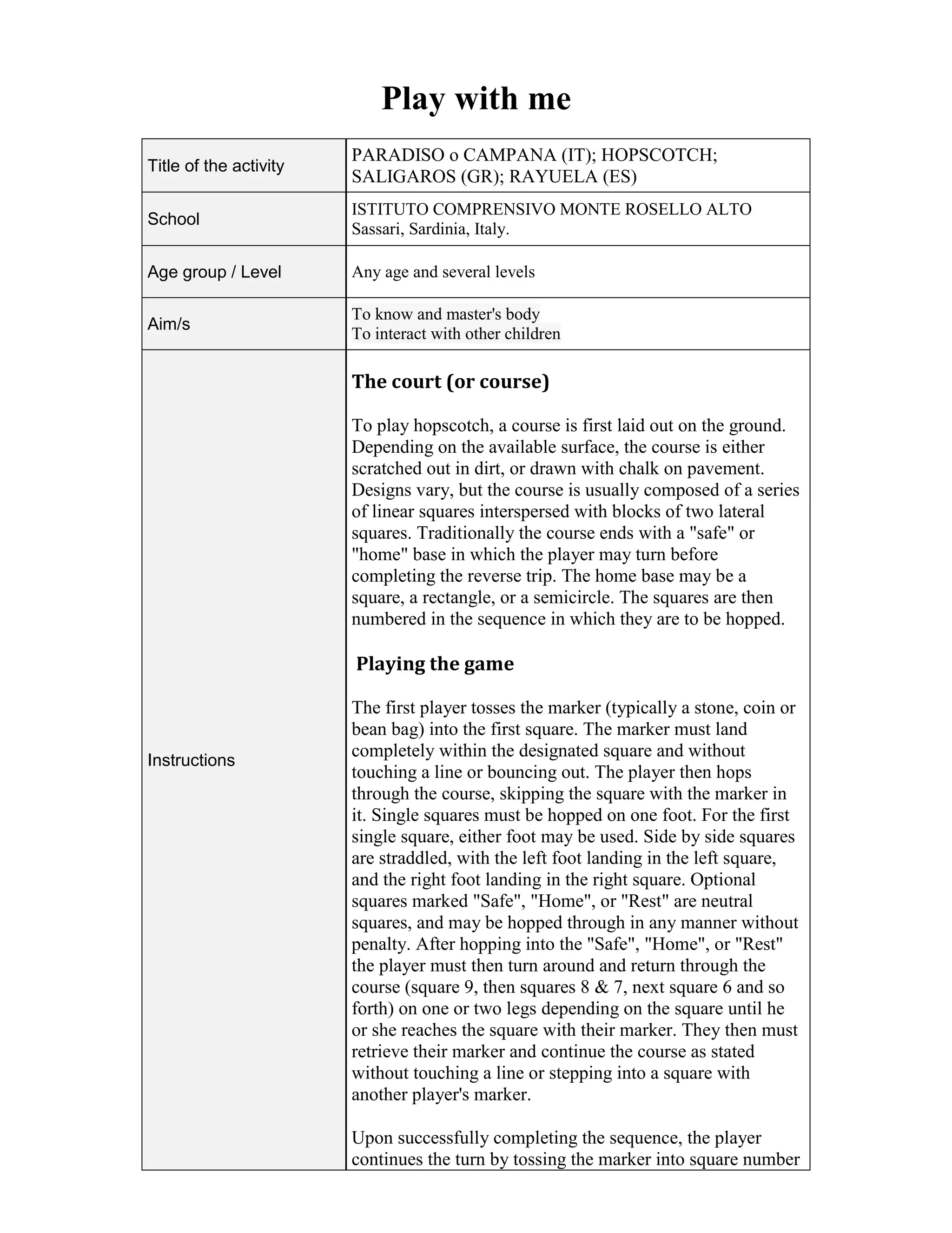 This document provides instructions for playing the game of hopscotch. It describes laying out a course on the ground by scratching or chalking numbered squares. The first player tosses a marker into the first square and hops through the course on one foot, skipping the square with the marker. Upon returning through the course, the player must pick up the marker. The goal is to complete the course for each numbered square without missing a step. There is no time limit and any number of players can participate. Hopscotch originated in Europe in the late 17th century under names like "scotch-hop" or "scotch-hoppers".