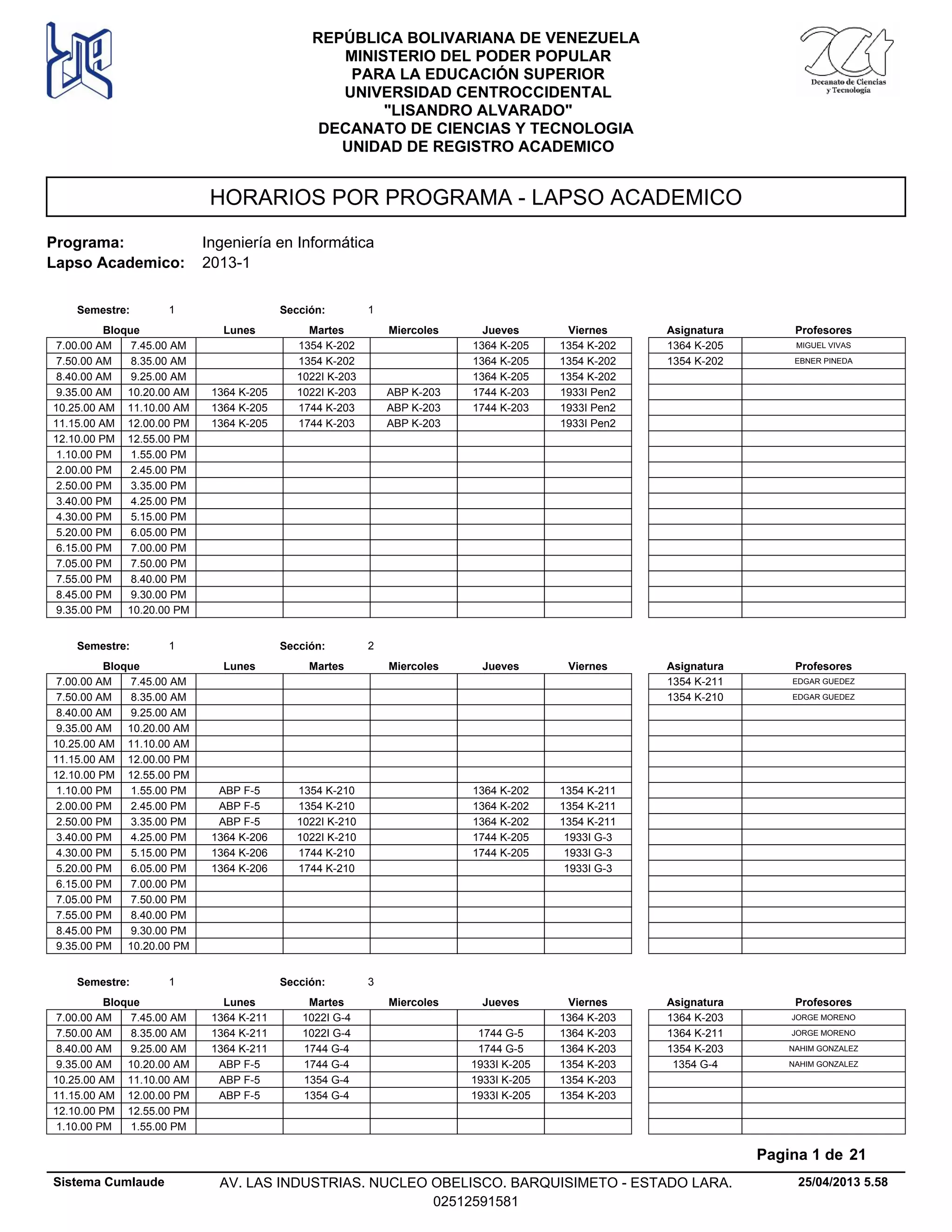 This document contains class schedules for 9 sections of the Computer Science program at a university in Venezuela for an academic period. It lists the class times, rooms, professors, and courses for each day of the week for each section.