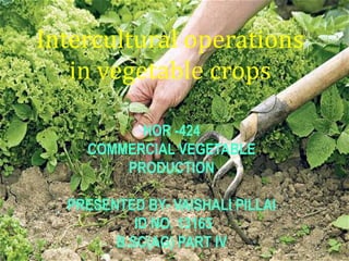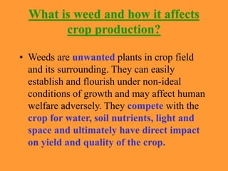 This document discusses weeds and methods of weed control in vegetable crops. It states that weeds compete with crops for resources like water, nutrients and light, reducing yields. Important weeds in different vegetable crops are described, including annual, biennial and perennial varieties. Methods of weed control discussed include physical/mechanical methods like tilling, hoeing and hand weeding; chemical methods using herbicides; cultural methods like mulching; and integrated weed management. Specific herbicides and their application times are also outlined for different vegetable crops.