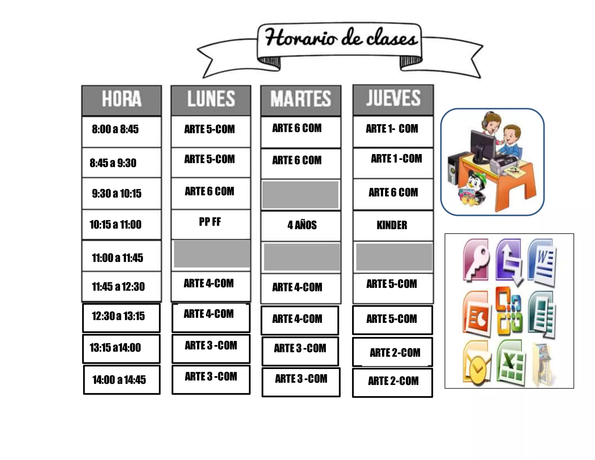 The document appears to be a class schedule listing various art courses with their times. It includes kindergarten as well as art courses 1 through 6, with some courses listed multiple times at different periods. The majority of courses are listed as taking place between 8am and 2:30pm, with some courses such as ARTE 5-COM and ARTE 6 COM listed more than once.