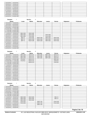 This document contains the class schedules for 8 sections of the Computer Engineering program at the Universidad Centroccidental Lisandro Alvarado for the 2012-1 academic period. It lists the course assignments, times, rooms, and professors for each class block on Mondays through Fridays. The program includes courses like Programming Fundamentals, Computer Architecture, and Software Engineering in the first semester.