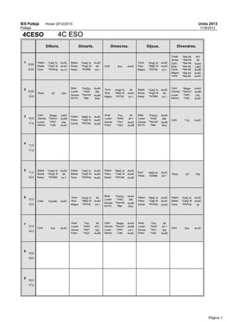 Horari 2012/2013 Untis 2013 Pallejà 11/9/2012 4CESO 4C ESO Dilluns. Dimarts. Dimecres. Dijous. Divendres. Fosal *Rel-Alt. Ati1 Buisa *Rel-Alt Idi 1 Padro *Cat2 3r. Au3C Basta *Cas2 3r. Au3C Torre *Ang2 3r. Au3C Corti *Rel-Alt Au4A 8:00 - Basta *Cas2 4t Au4C Buisa *Ang2 4t Idi Corti Soc Au4C Ruiz *Mat2 4t Au4C Bote *Rel-Alt Lab2 9:00 Torre *AOAng Au1C Perez *AOMat Inf 1 Magra *AOCat Inf 1 Ferra *Rel-Alt Au4B Magra *Rel-Alt Au4C Torre *Rel-Alt Au4A Bote *FisQui. Au4A Carri *Bioge. Au4A 2 Torre Ang2 3r. Idi Basta *Cas2 3r. Au3C 9:00 Lucen *Info2 Dib Gomez *Tecno1 Au4B - Roca EF Gim Ruiz Mat2 4t Au4C Buisa *Ang2 4t Idi Gomez *Tecno2 Au4B AOCat *AOMat Lucen *Info1 Dib 10:0 Magra Inf 1 Perez Inf 1 De Po *Mat Mus Hermo *Llati Au4C Carri *Bioge. Lab3 Alvar *Fra. Idi Bote *FisQui. Au4A 3 Palom *Mat2 3r. Au3C 10:0 Gomez *Tecno1 Au4B Lucen *Info3 Inf 1 Lucen *Info2 Dib - Piany *Cat2 4t Au4C Corti *Tut Au4C Lucen *Info1 Dib Gonza *Vip1 Au4C Gomez *Tecno2 Au4B 11:0 Gome *AOCas Au3D Hermo *Llati Au4C Franc *Vip2 Au4B De Po *Mat Mus 4 11:0 - 11:3 5 Basta *Cas2 3r. Au3C Padro *Cat2 3r. Au3C Palom *Mat2 3r. Au3C 11:3 Ruiz Mat2 4t. Au4C - Buisa *Ang2 4t Idi Basta *Cas2 4t Au4C Piany *Cat2 4t Au4C Roca EF Pist Perez AOMat Inf 1 12:3 Perez *AOMat Inf 1 Torre *AOAng Au3A Gome *AOCas Au3D Bote *FisQui. Au4A 6 Torre *Ang2 3r. Idi Palom *Mat2 3r. Au3C Padro *Cat2 3r. Au3C 12:3 Lucen *Info2 Dib - Coso Eduetic Au4C Ruiz *Mat2 4t Au4C Piany *Cat2 4t Au4C Basta *Cas2 4t Au4C *AOCat Gomez *Tecno2 Au4B *AOCas Au3D *AOAng 13:3 Magra Inf 1 Gome Torre Idi De Po *Mat Mus Alvar *Fra. Idi Carri *Bioge. Au4A Alvar *Fra. Idi 7 13:3 Lucen *Info3 Inf 1 Gomez *Tecno1 Au4B Lucen *Info3 Inf 1 - Corti Soc Au4C Corti Soc Au4C Gonza *Vip1 Dib Lucen *Info1 Inf 1 Gonza *Vip1 Dib 14:3 Franc *Vip2 Au4B Hermo *Llati Au4C Franc *Vip2 Au4B 8 15:0 - 16:0 9 16:0 - 17:0 Pàgina 1