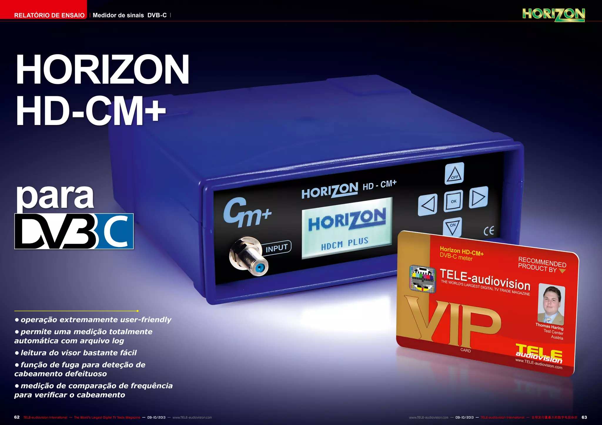 The document tests and reviews the Horizon HD-CM+ DVB-C signal meter. It finds that the meter is easy to operate, comes with many useful accessories, and provides accurate, reliable measurements of signal levels and quality parameters on DVB-C networks. Testing showed the meter performed well, with clear display readability and measurement values closely matching those of a reference meter. The HD-CM+ was concluded to be a powerful professional tool for installers.