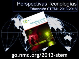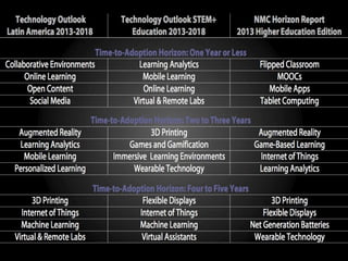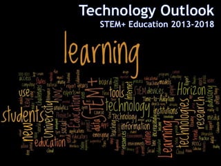 The document summarizes the NMC Technology Outlook for STEM+ Education 2013-2018 report, which explores emerging technologies for STEM education over the next five years. The report is a collaboration between multiple organizations and funded by a grant from CSEV. It examines technologies impacting higher education, K12, and other areas. The report identifies technologies to watch in the next one, two to three, and four to five years, such as learning analytics, mobile learning, online learning, virtual labs, 3D printing and more. Examples are provided for each time period. The document encourages participation by tagging on social media, commenting on the report, joining the advisory board, and submitting projects.