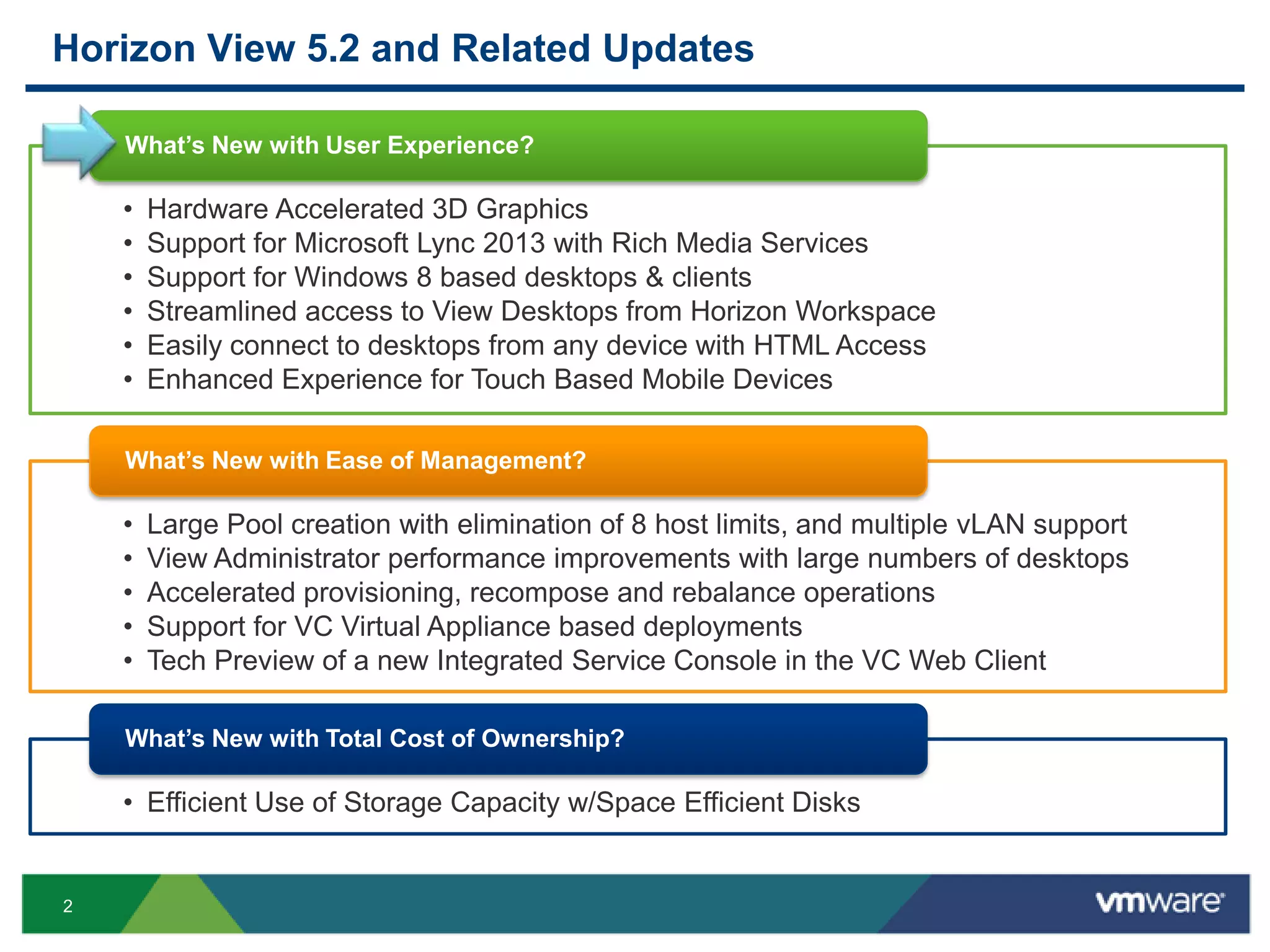 Horizon View 5.2 introduces several new features including hardware accelerated 3D graphics, support for Microsoft Lync 2013 with rich media services, support for Windows 8 desktops and clients, streamlined access to View desktops from Horizon Workspace, HTML access to connect from any device, and an enhanced experience for touch-based mobile devices. The release also improves the user experience with large pool creation and multi-VLAN support, improved View Administrator performance, and accelerated provisioning, recompose, and rebalance operations. Management is eased through support for Virtual Center virtual appliances, a tech preview of View integration into the vSphere web client, and more efficient use of storage capacity with space efficient disks.