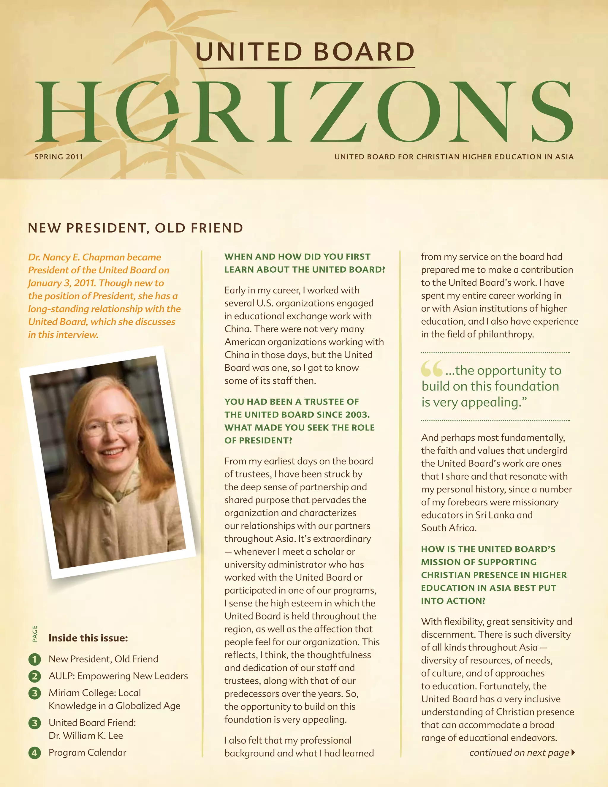 Dr. Nancy E. Chapman has become the new President of the United Board for Christian Higher Education in Asia. Though new to the role of President, she has a long history with the United Board dating back to her early career working with organizations engaged in educational exchange with China. As a long-time trustee since 2003, she was drawn to the role of President by the deep sense of partnership and shared purpose that characterizes the United Board's relationships with its partners in Asia. Her background in Asian higher education and experience in philanthropy prepared her to make a contribution. She hopes to build on the United Board's foundation with flexibility, great sensitivity, and discernment for the diversity of Asia.