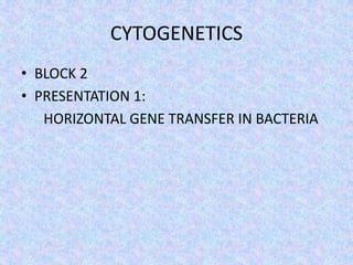 The document discusses horizontal gene transfer (HGT) in bacteria, emphasizing its distinction from vertical gene transfer. It describes various mechanisms of HGT, including transformation, conjugation, and transduction, and highlights the significance of HGT in bacterial evolution and adaptability. HGT facilitates rapid genetic changes, enabling bacteria to acquire traits necessary for survival in changing environments.