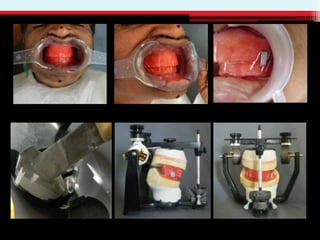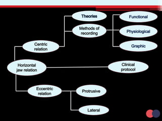 The document discusses horizontal jaw relations, specifically defining the relationship of the mandible to the maxilla in various orientations, including centric, eccentric, protrusive, and lateral relations. It covers the significance of centric relation as a reliable guide for developing occlusion in dentures, the factors influencing recording it, and the various methods to record jaw relations effectively. Additionally, it explains the underlying theories and difficulties encountered during the process of recording these relations.