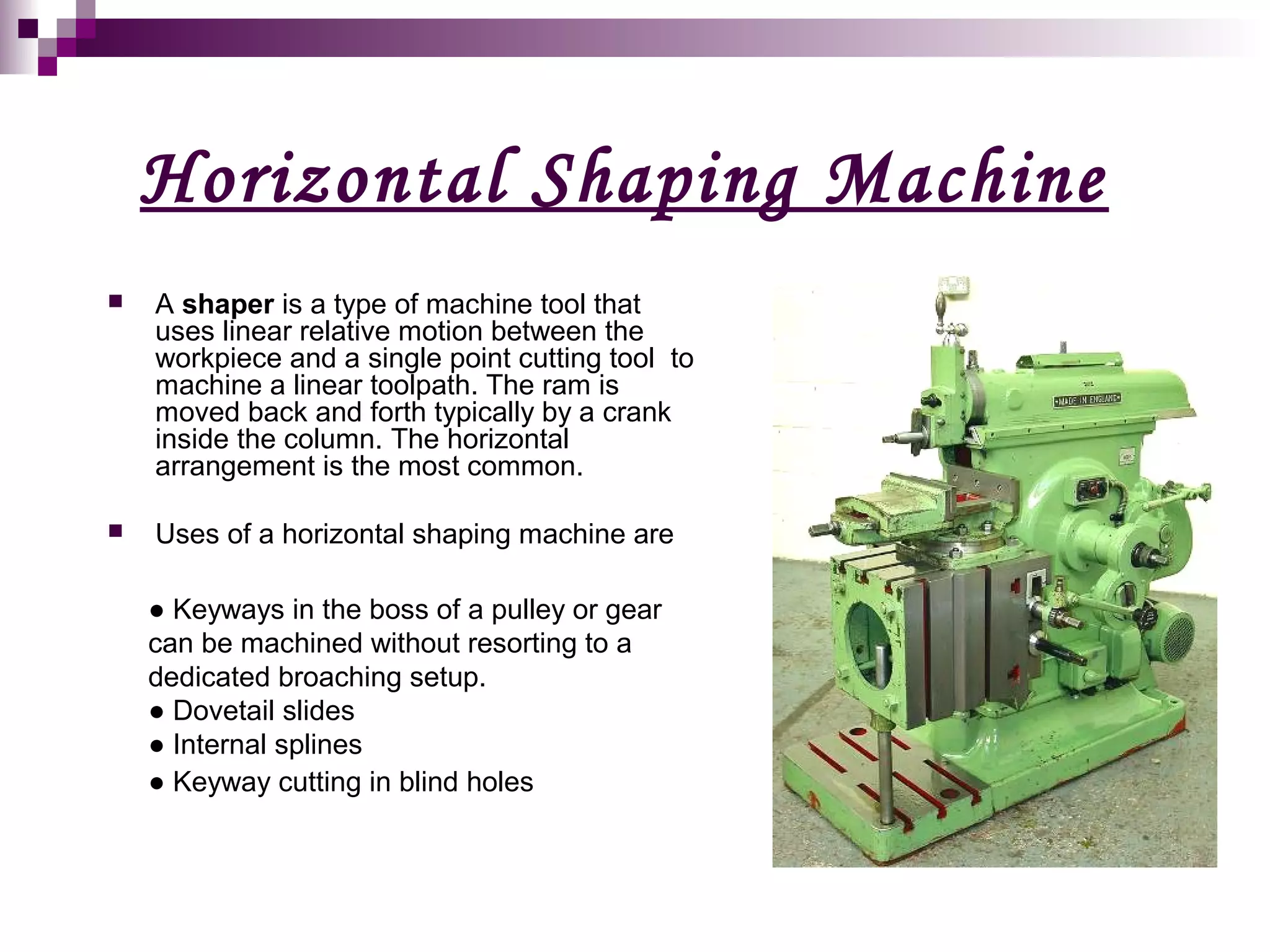 The document describes a horizontal shaping machine, which is a type of machine tool that uses linear motion between a single point cutting tool and workpiece to machine linear toolpaths. It operates by moving the cutting tool back and forth across the workpiece on the forward stroke only, while lifting the tool on the return stroke. Keyways, dovetails, splines, and keyways in blind holes can all be machined using a horizontal shaping machine by adjusting the position of the cutting tool.