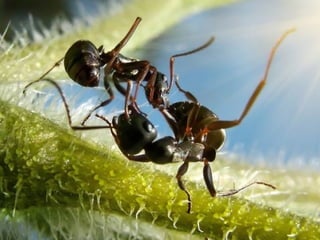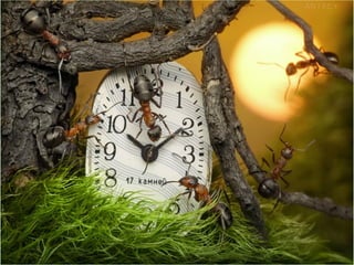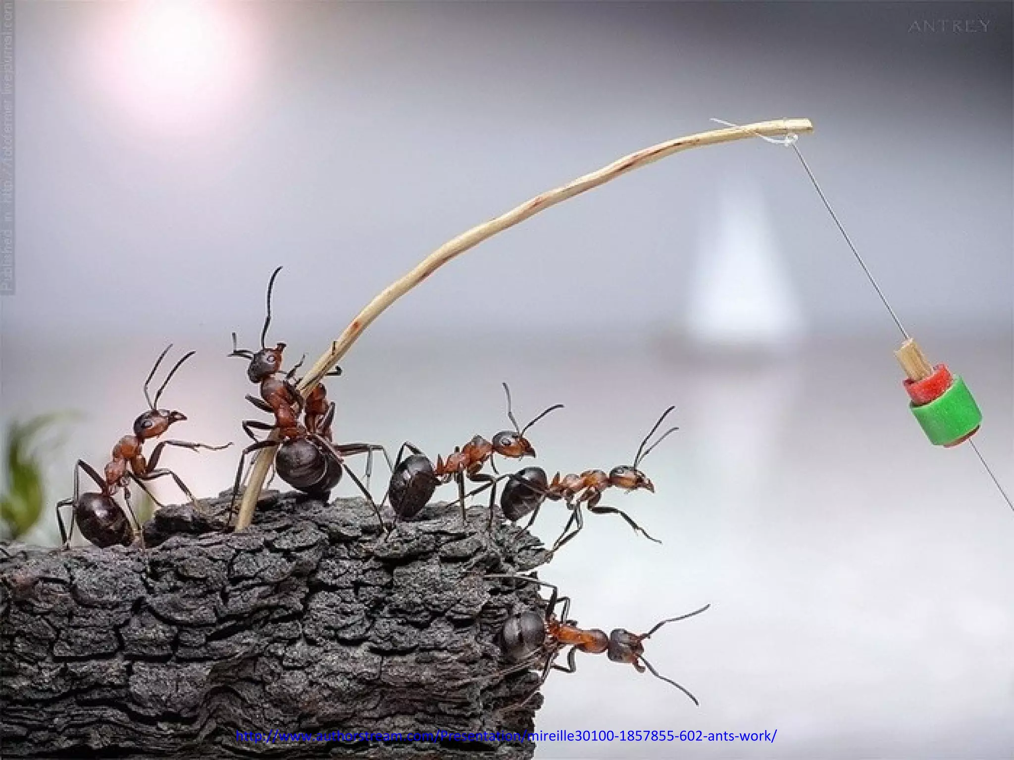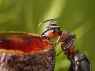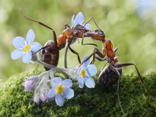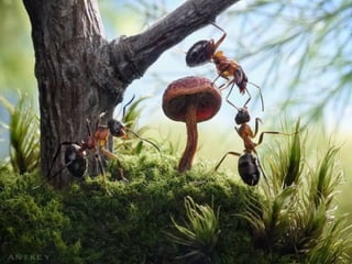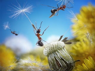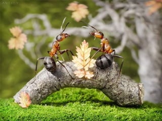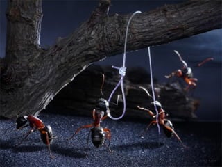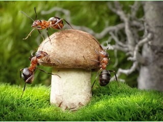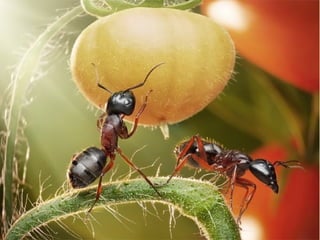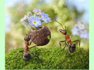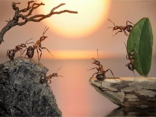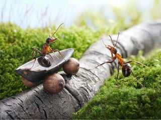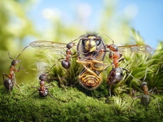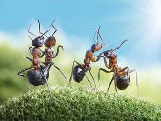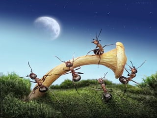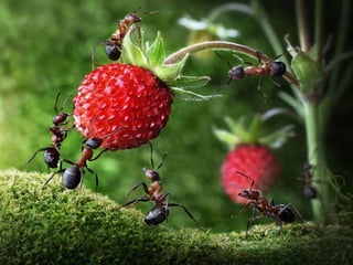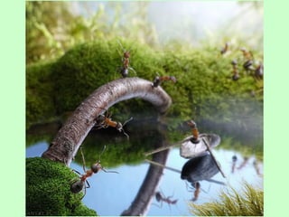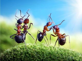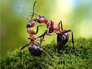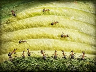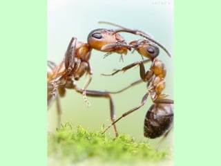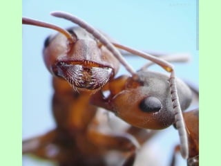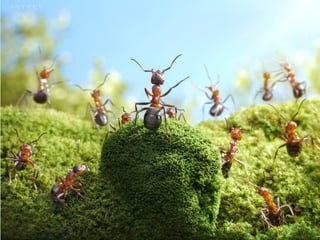 Ants live and work in colonies that can contain millions of individuals. They divide labor among castes that include winged reproductive ants, soldiers that defend the colony, and workers that gather food, care for the queen and larvae, and build structures. Ants communicate through pheromones, touch, and other senses and work together with great efficiency to support their colony.