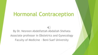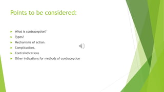 This document discusses hormonal contraception, including combined oral contraceptives (COCP), the contraceptive patch, vaginal ring, and progestogen-only methods. It covers the types of hormones used, modes of action, indications, contraindications, risks and side effects. Combined methods primarily prevent ovulation while also thickening cervical mucus and thinning the endometrium. Progestogen-only methods primarily work by thickening cervical mucus but can also prevent ovulation or thin the endometrium. Contraindications depend on medical conditions and are classified by the WHO. Risks include minor side effects as well as serious risks like blood clots and certain cancers.