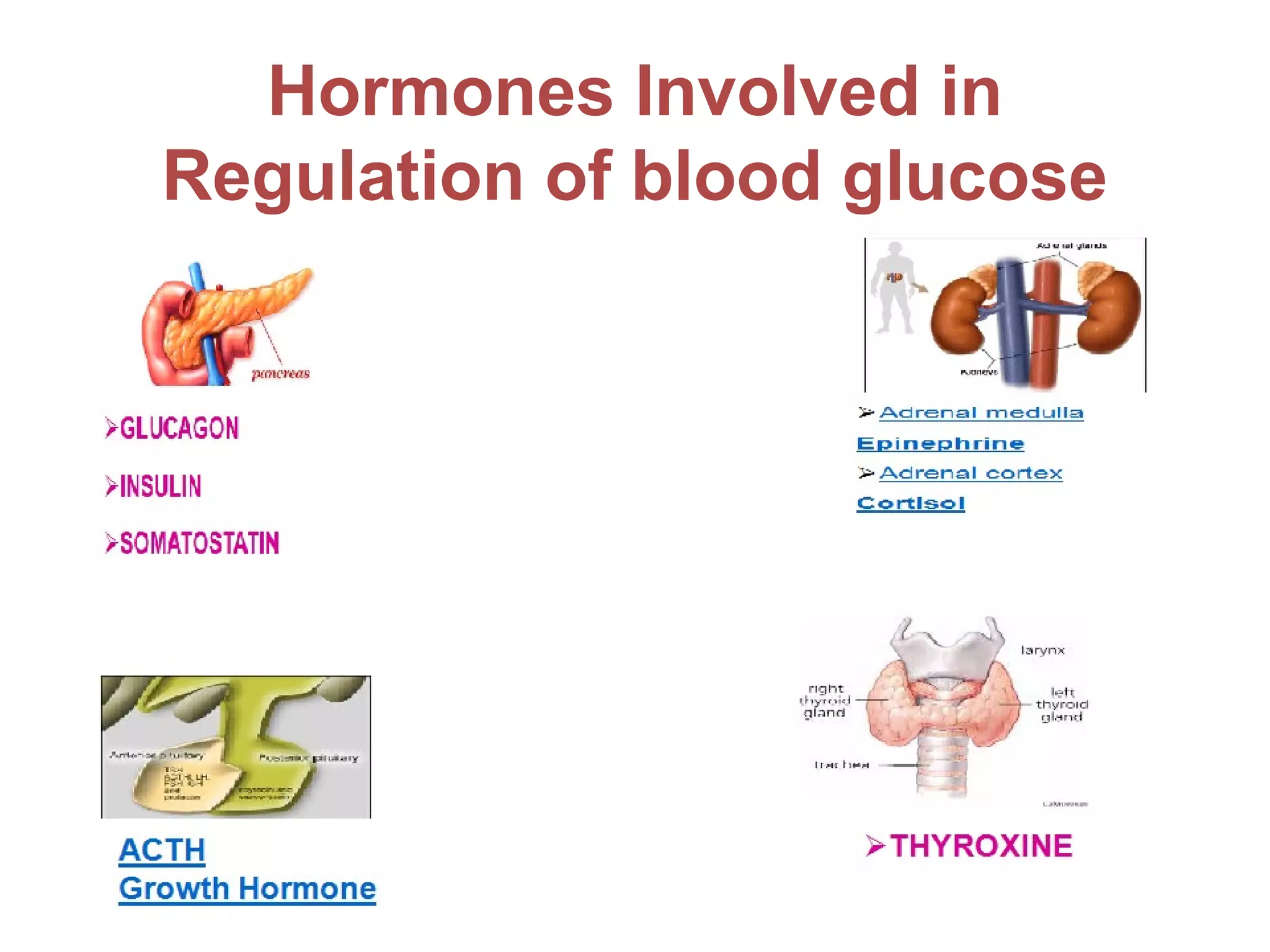 This document discusses the hormonal regulation of blood glucose levels. It outlines several hormones that increase blood glucose, including glucagon, epinephrine, cortisol, ACTH, growth hormone, and thyroxine. These hormones cause the liver to produce glucose or break down glycogen and fat stores to release glucose. Insulin and somatostatin decrease blood glucose by promoting the uptake of glucose from the bloodstream into cells and suppressing glucagon secretion. The pancreas, adrenal glands, pituitary gland, and thyroid gland all secrete hormones that work together to maintain blood glucose homeostasis.